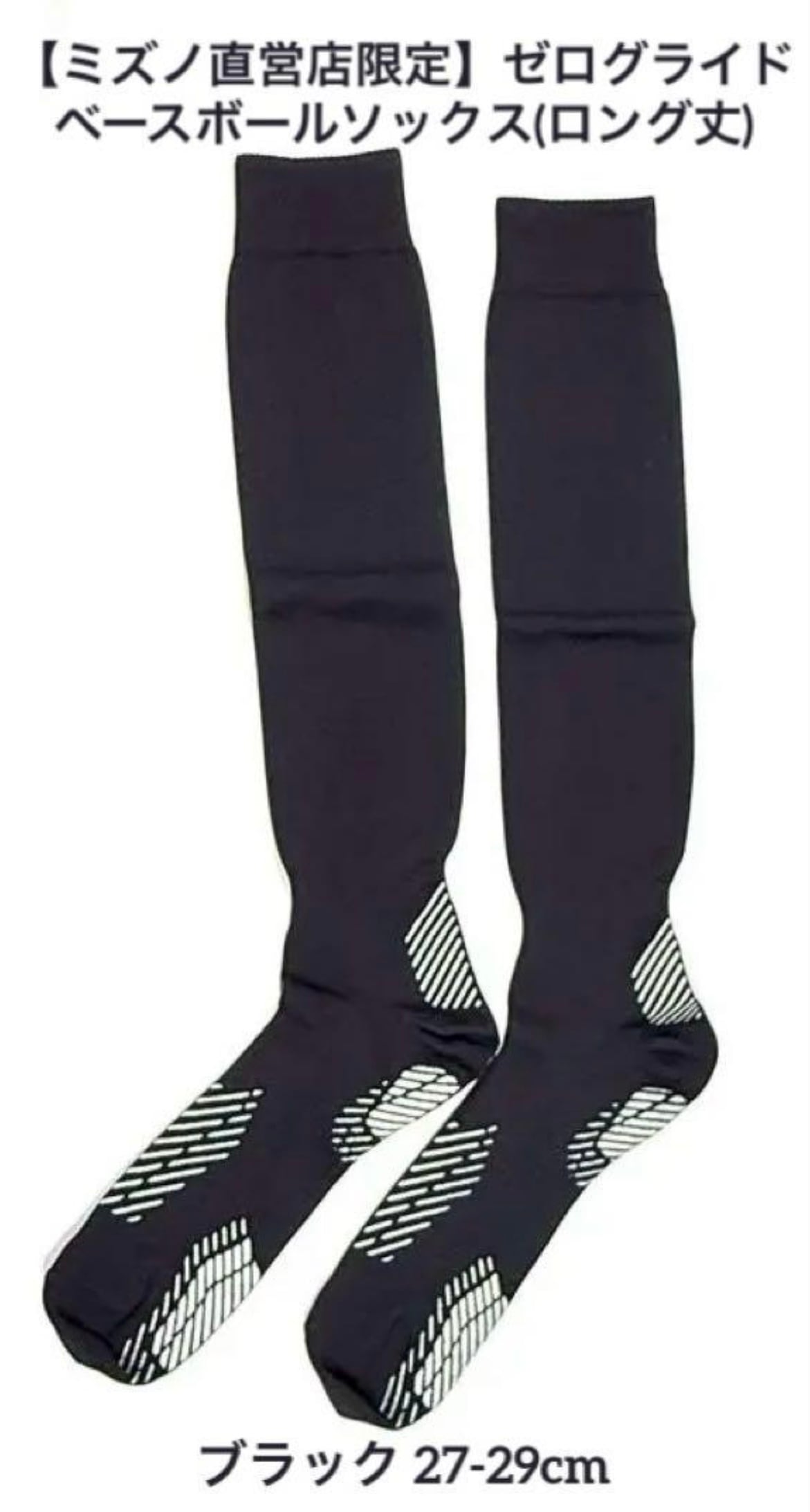 【ミズノ直営店限定】ゼログライド ベースボールソックス(ロング丈) です。グッリップがかなりしっかりあり、打席での踏ん張りや、走り出しの一歩目が違います。いかがでしょうか!